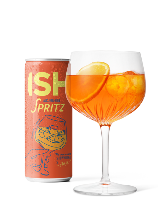 ISH Spritz can be enjoyed straight from the chilled can or in a balloon glass with a fresh orange slice. Want to add a slight buzz? Simply add a splash of Prosecco to your ISH Spritz. The result is a spirited cocktail, significantly less alcoholic than the traditional Spritz.